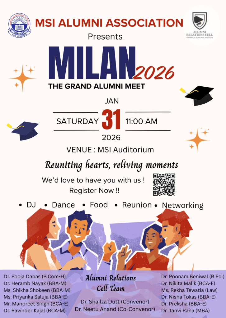 Maharaja Surajmal Institute is pleased to invite you all for the Alumni Meet 2026 to be held on 31/Jan/2025 in the Institute itself 11:00 AM onwards.